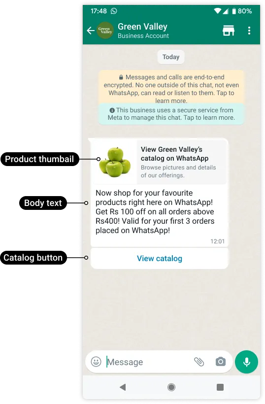 Catalog templates are marketing templates that allow you to showcase your product catalog entirely within WhatsApp. Catalog templates display a product thumbnail header image of your choice and custom body text, along with a fixed text header and fixed text sub-header.