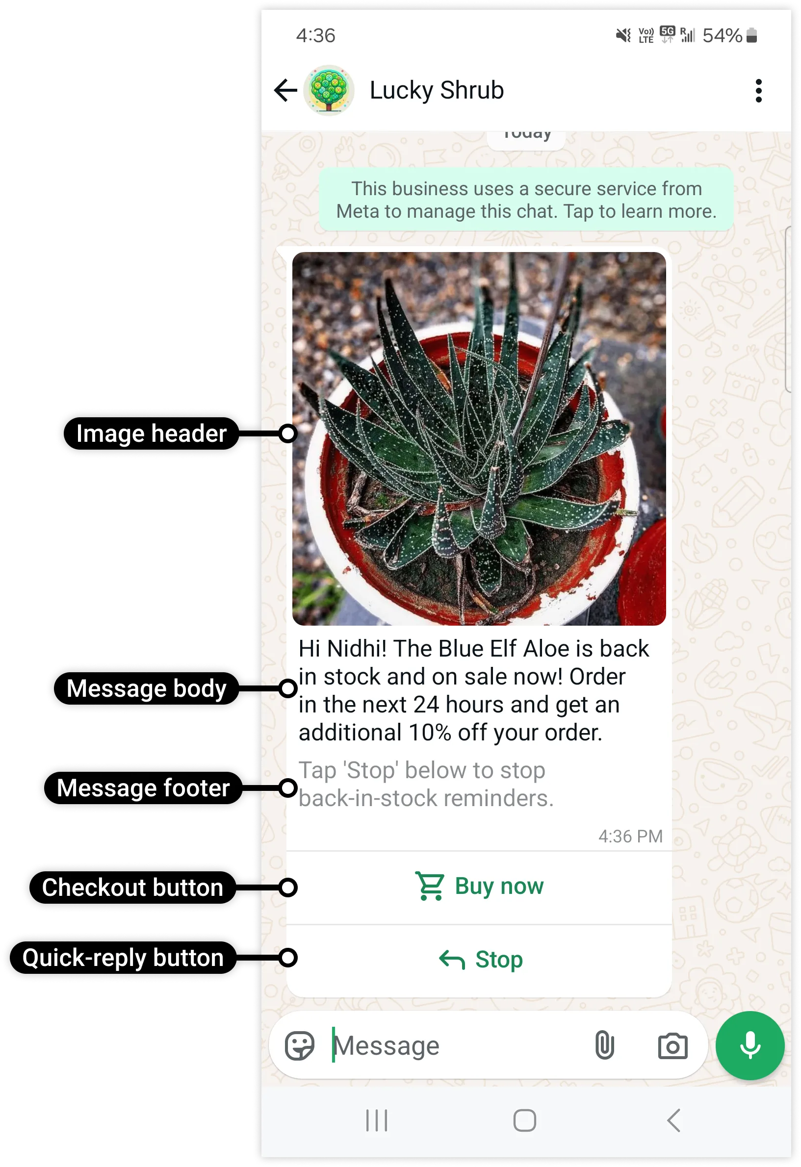 Note that this is simply a button definition. The actual details about the product that maps to this button are included when you send the template in a template message. For example:
