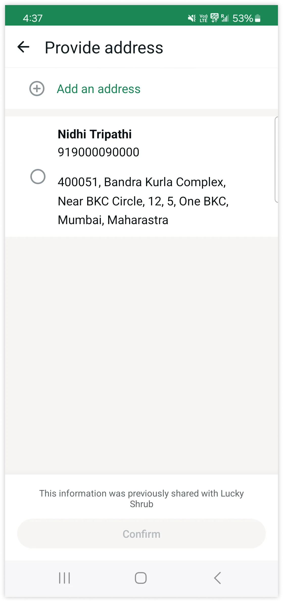 <SHIPPING_INFO_ADDRESS>String | Required if you know the recipient’s shipping information. Product recipient’s address. Maximum 512 characters. | Bandra Kurla Complex |