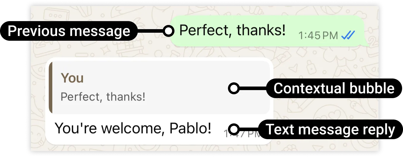 Contextual replies are a special way of responding to a WhatsApp user message. Sending a message as a contextual reply makes it clearer to the user which message you are replying to by quoting the previous message in a contextual bubble: