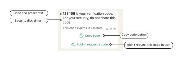 Copy code authentication templates allow you to send a one-time password or code along with a copy code button to your users. When a WhatsApp user taps the copy code button, the WhatsApp client copies the password or code to the device’s clipboard. The user can then switch to your app and paste the password or code into your app.
