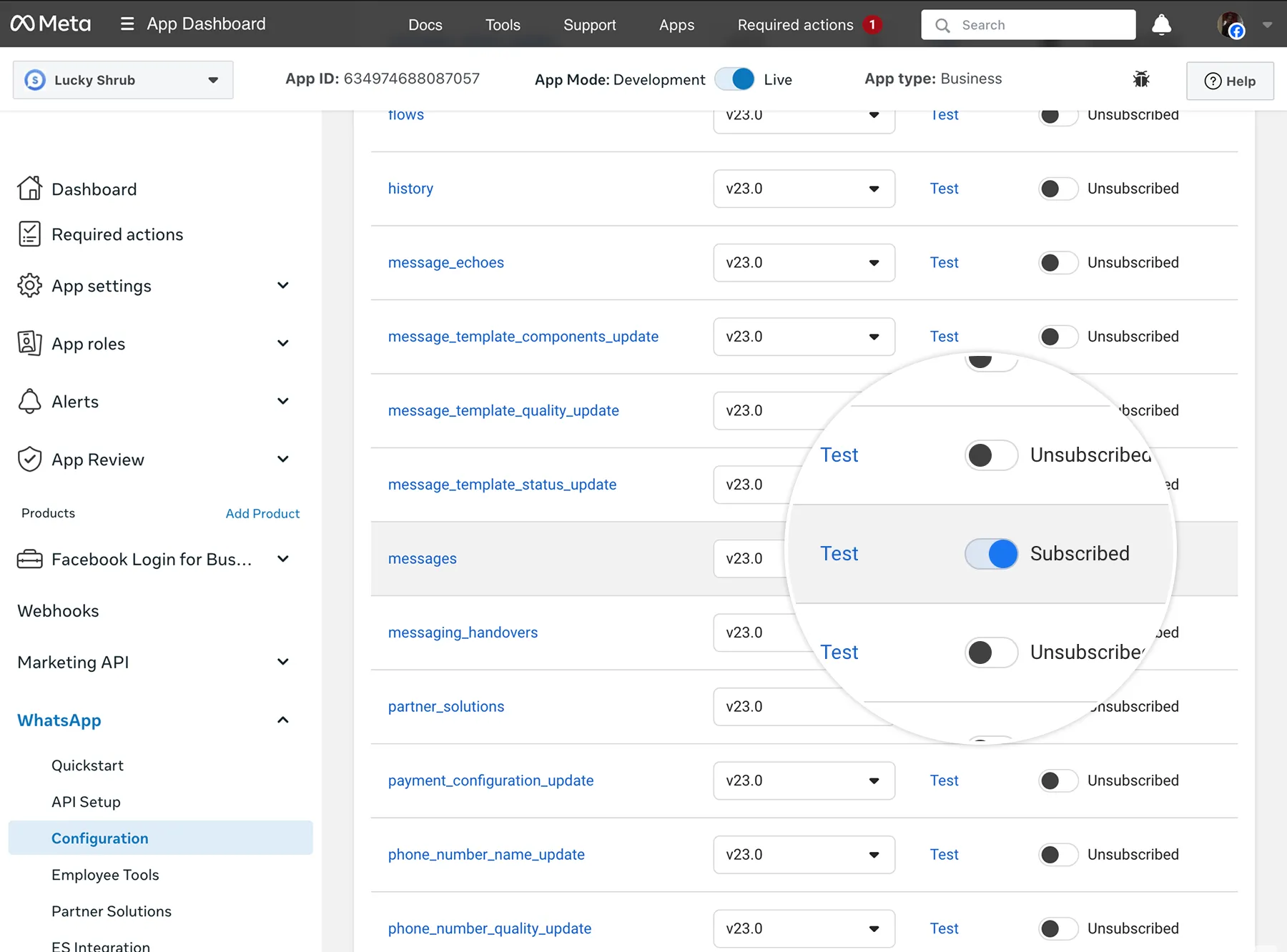 Back in the Meta app dashboard Configuration panel, scroll down to the messages webhook field, subscribe to the field if you haven’t already, then click the Test link.