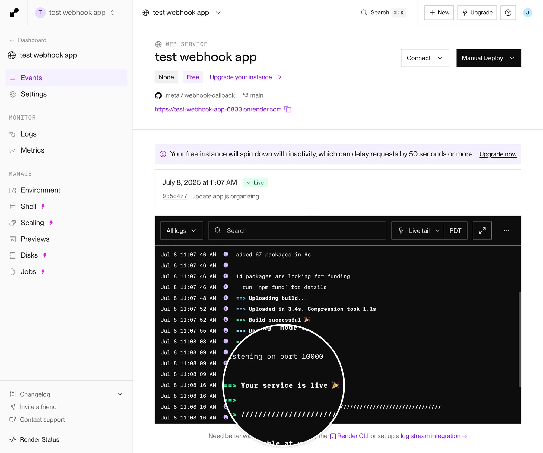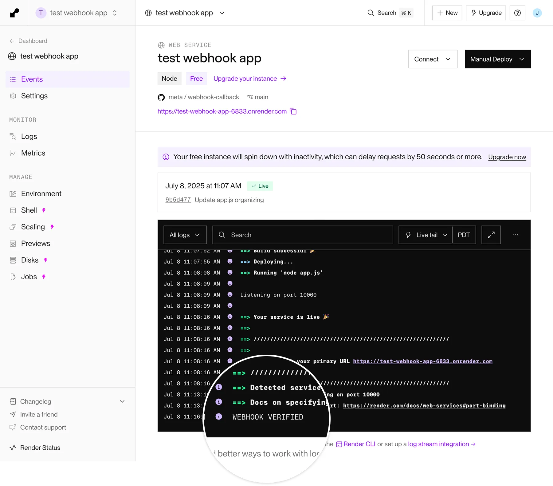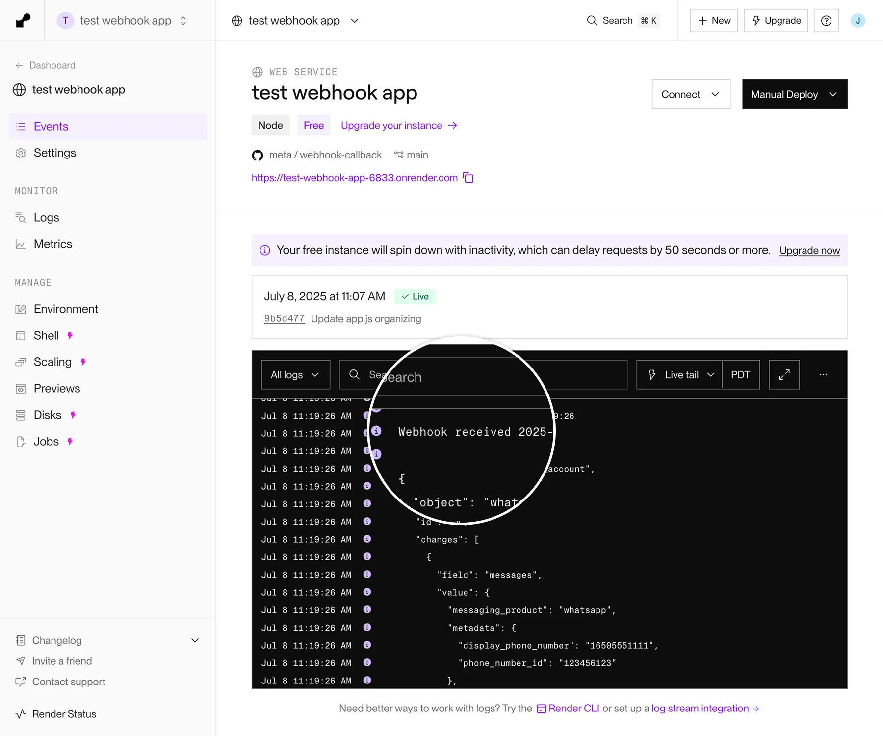 This will send a test message to your test webhook app. Confirm that it appears in Render app log with “Webhook received” followed by a test JSON payload: