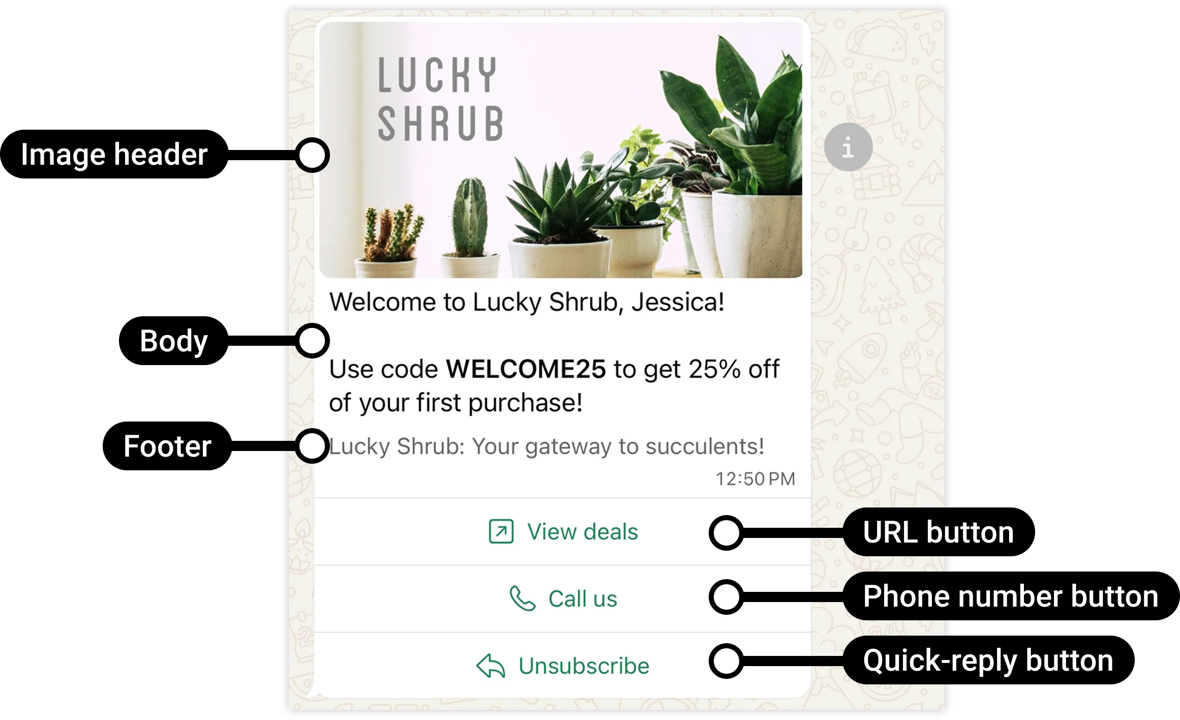 <FOOTER_TEXT>String | Optional. Footer text. Maximum 60 characters. | Lucky Shrub: Your gateway to succulents! |