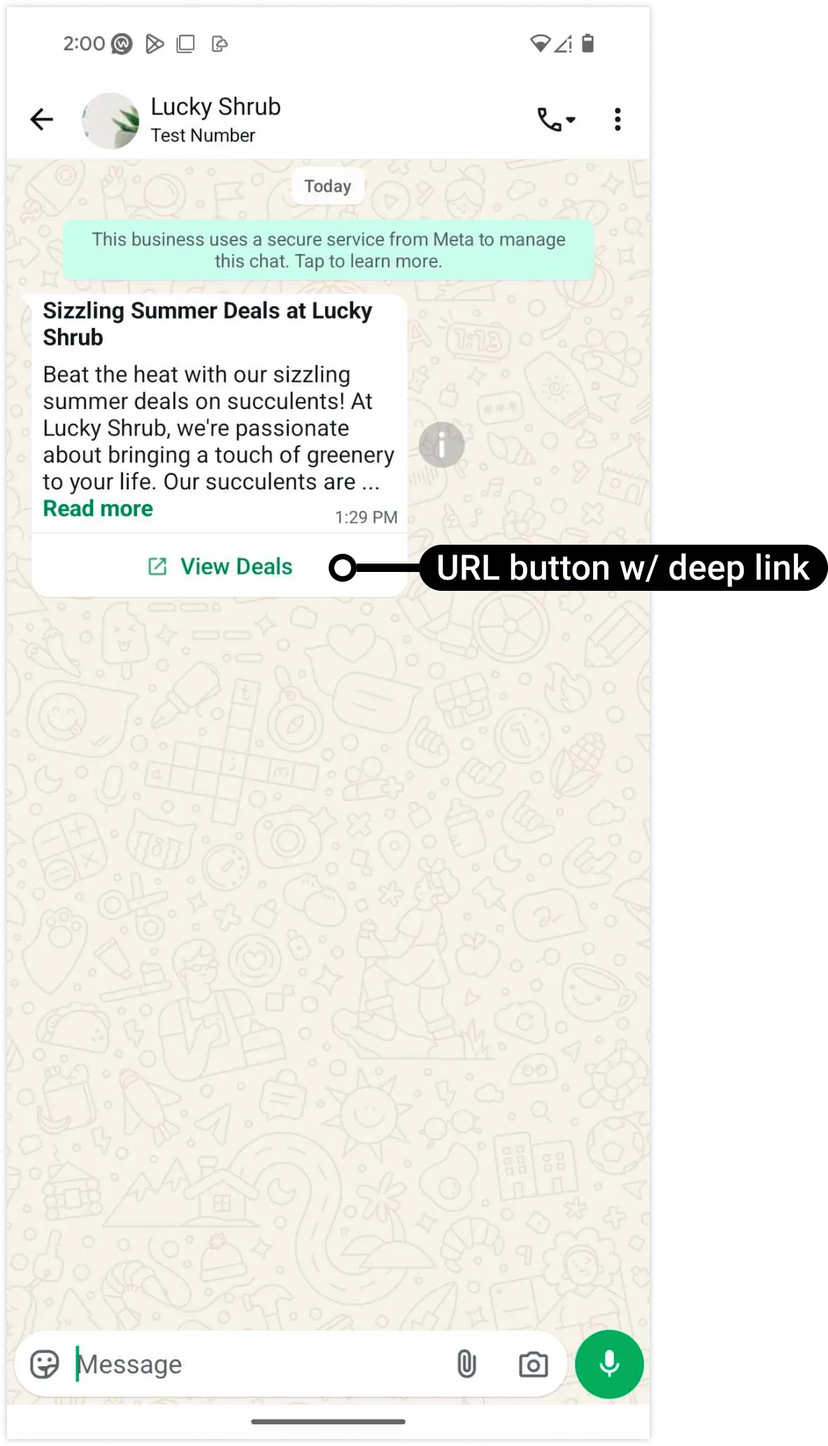 For deep links, this URL only be used if the WhatsApp user taps the button on a non-Android device. | https://www.luckyshrub.com/deals/summer/ |