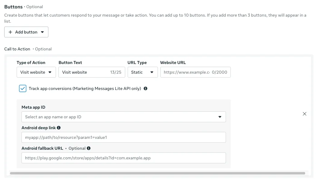 Use the POST /<WHATSAPP_BUSINESS_ACCOUNT_ID>/message_templates endpoint to create the template and include a URL button component mapped to your Android deep link.
