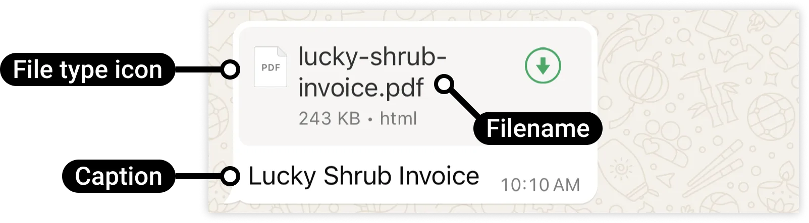 Document messages are messages that display a document icon, linked to a document, that a WhatsApp user can tap to download.