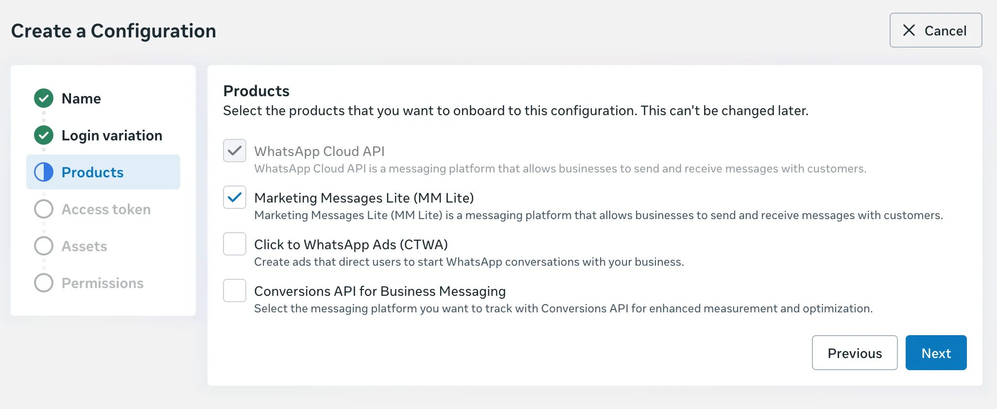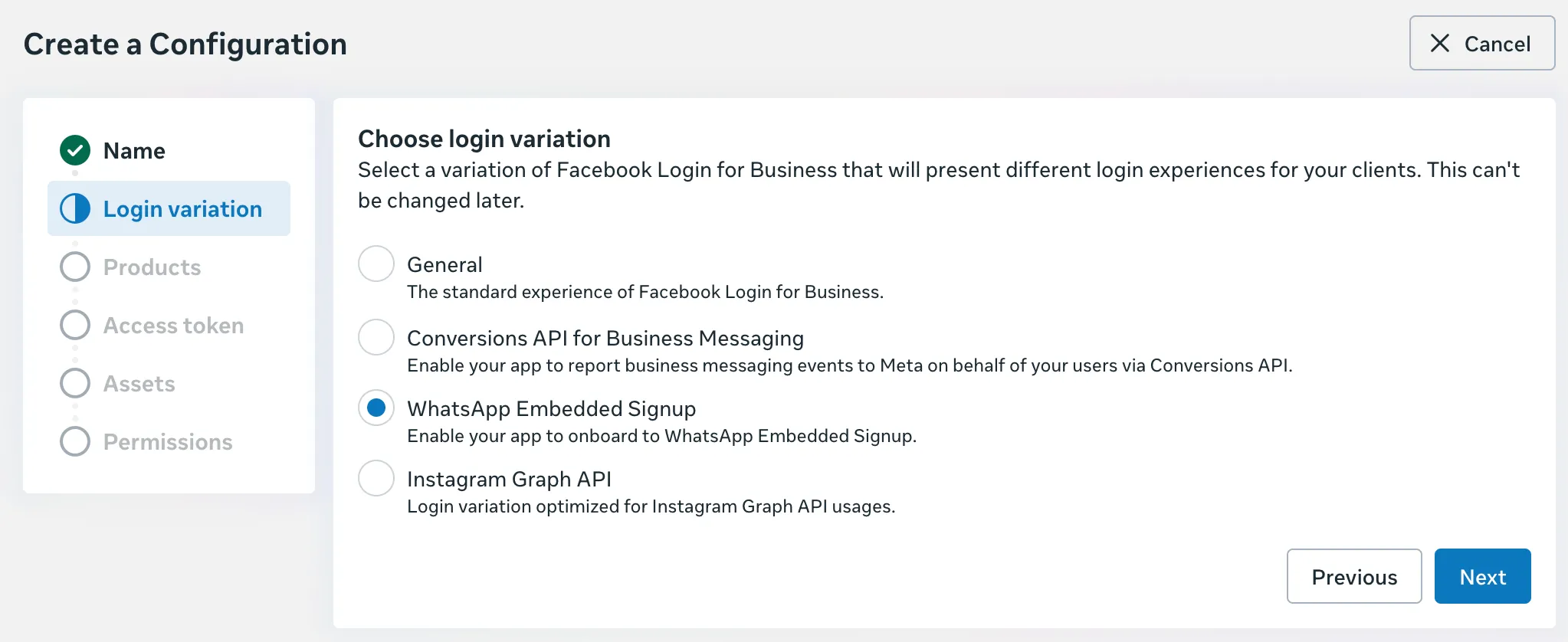 Alternatively, you create a custom configuration. To do this, in the Configurations panel, click the Create configuration button and provide a name that will help you differentiate the custom configuration from any others you may create in the future. When completing the flow, be sure to select the WhatsApp Embedded Signup login variation: