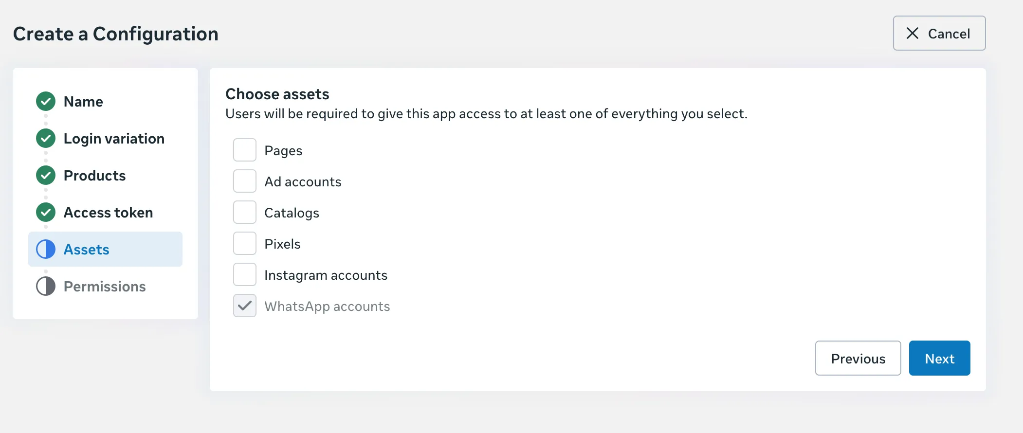 For example, if you select the Catalogs asset but don’t actually need access to customer catalogs, your customers will likely abandon the flow at the catalog selection screen and ask you for clarification.