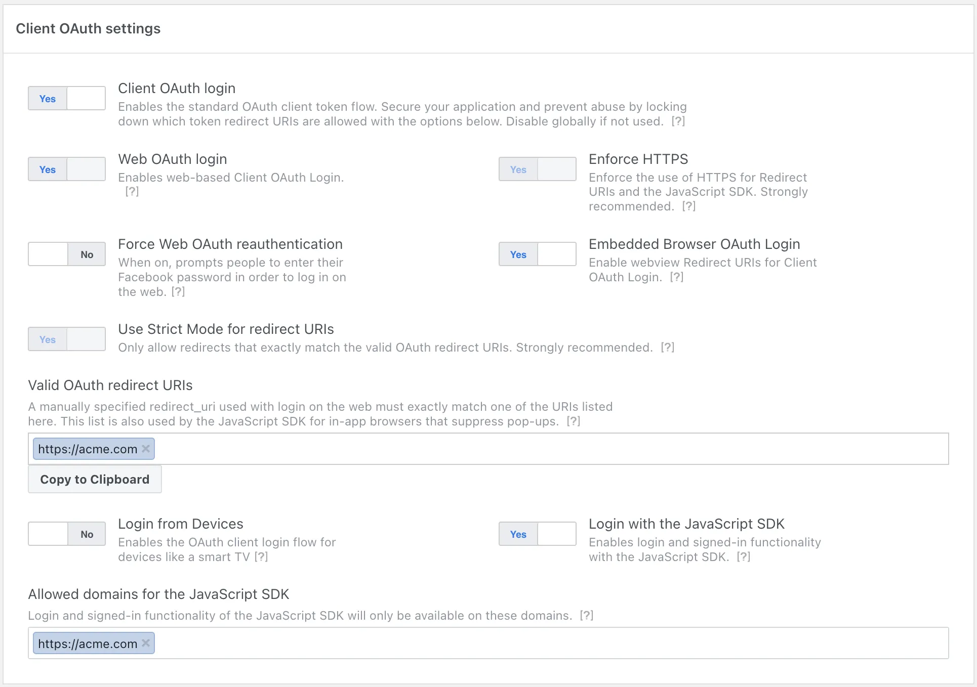 Load your app in the App Dashboard and navigate to Facebook Login for Business > Settings > Client OAuth settings: