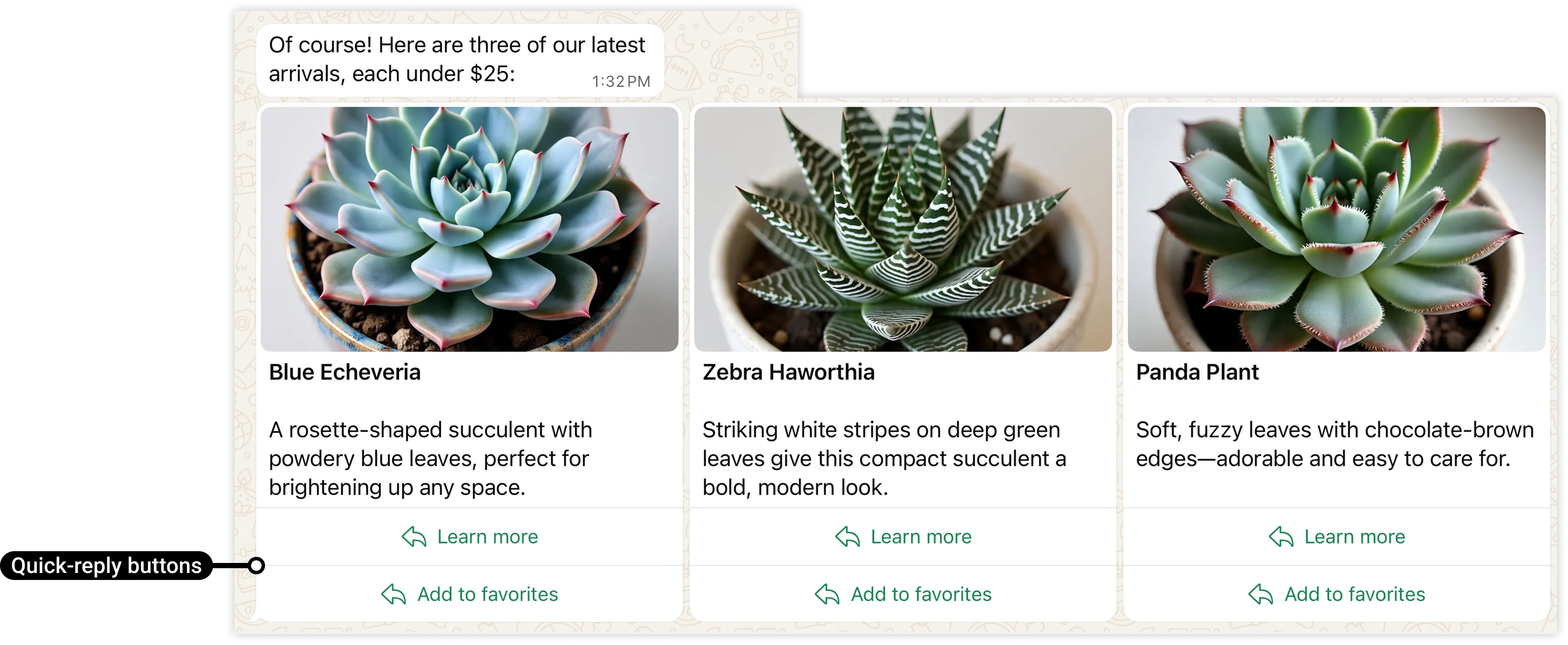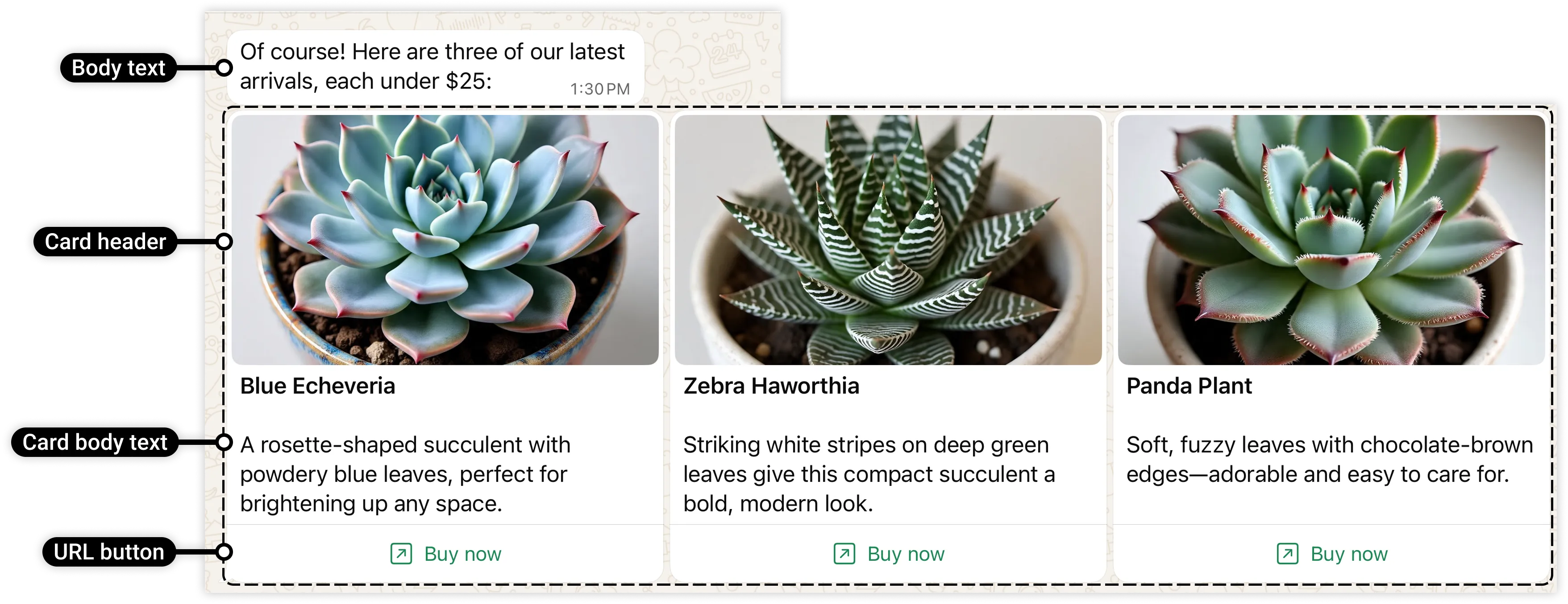 <CARD_BODY_TEXT>String | Optional. Card body text. Max 160 characters, and up to 2 line breaks. | *Blue Echeveria*\n\nA rosette-shaped succulent with powdery blue leaves, perfect for brightening up any space. |