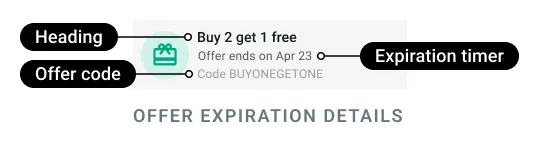 The delivered message can display an offer expiration details section with a heading, an optional expiration timer, and the offer code itself.