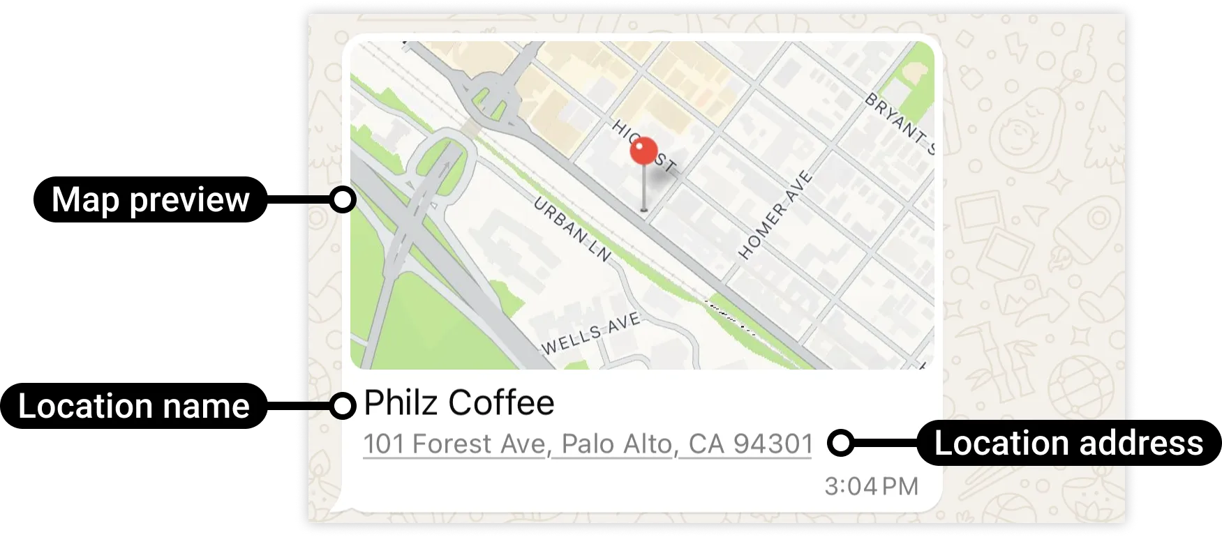 Location messages allow you to send a location’s latitude and longitude coordinates to a WhatsApp user.