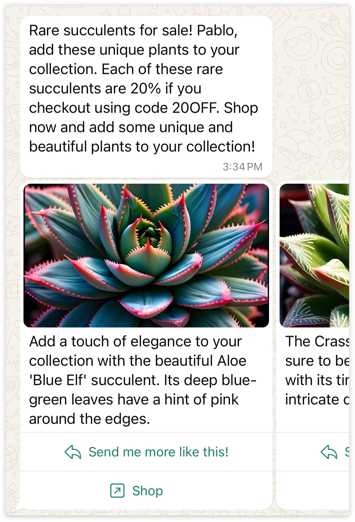 Single-product message templates allow you to send a single text message accompanied by a set of up to 10 product cards in a horizontally scrollable view: