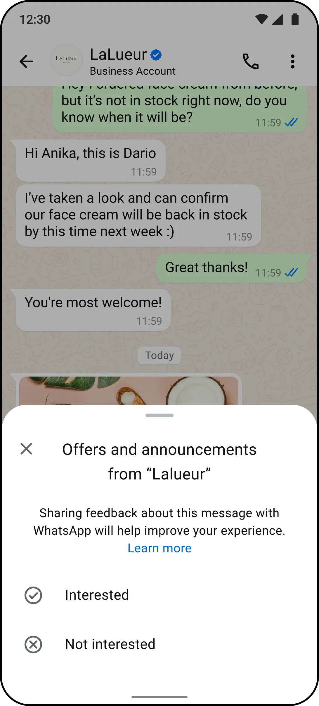 WhatsApp users can use the Offers and announcements setting to indicate how interested they are in receiving marketing template messages from your business.