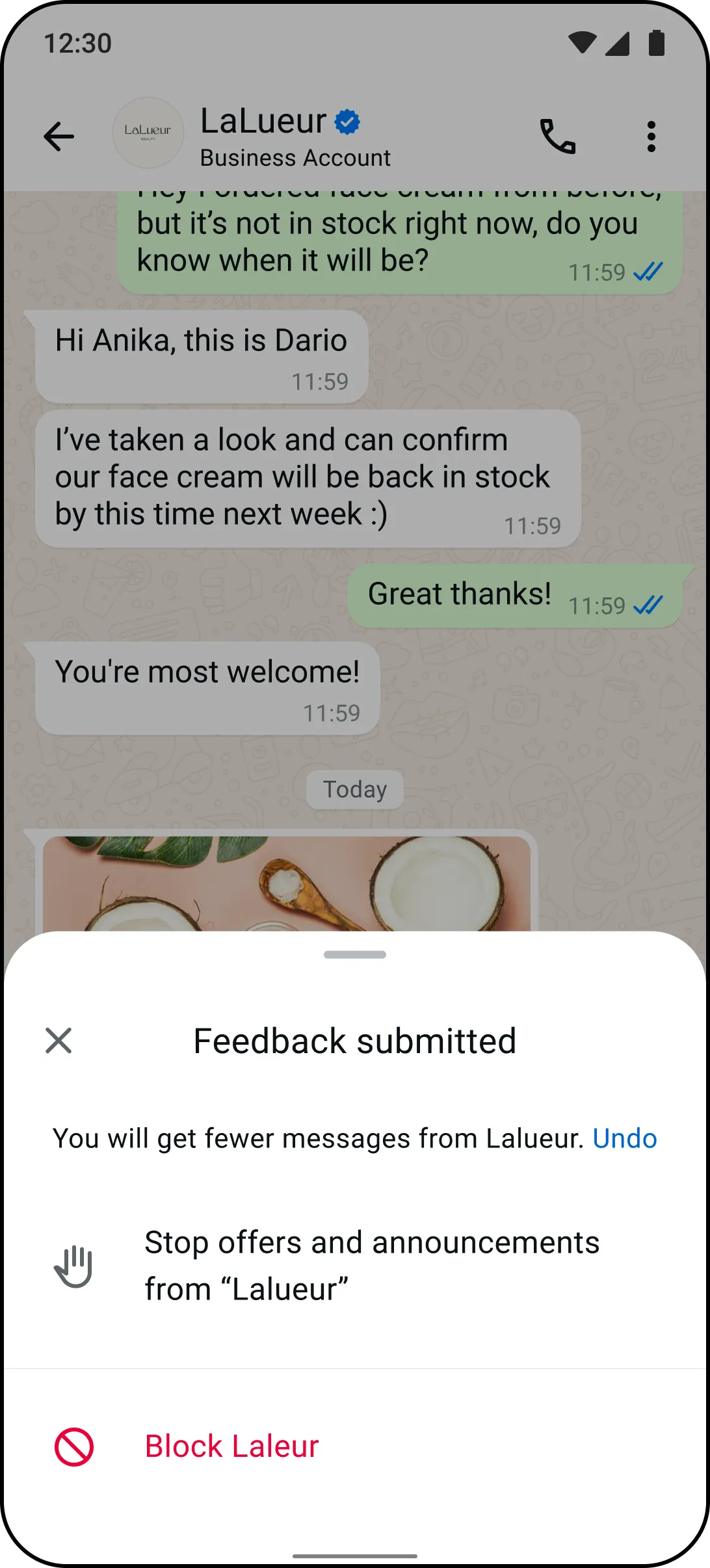 WhatsApp provides a setting, Offers and announcements, that allows WhatsApp users to indicate their interest level in marketing messages sent from your business, and to stop or resume delivery of marketing messages from your business entirely.