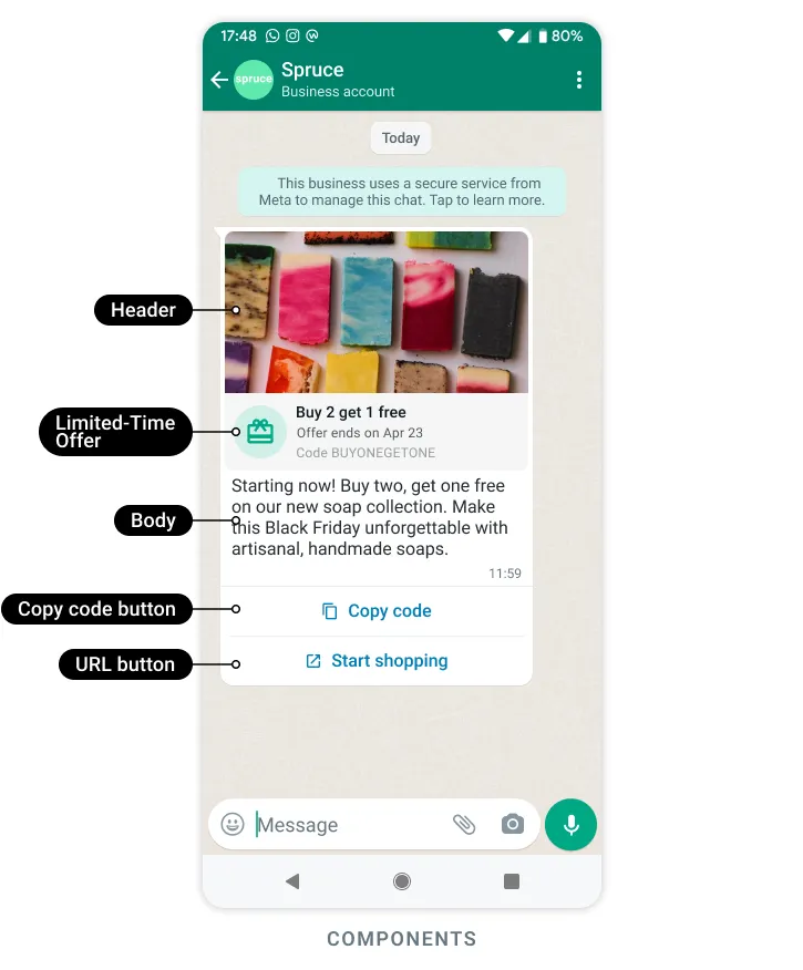 Limited-time offer templates allow you to display expiration dates and running countdown timers for offer codes in template messages, making it easy for you to communicate time-bound offers and drive customer engagement.