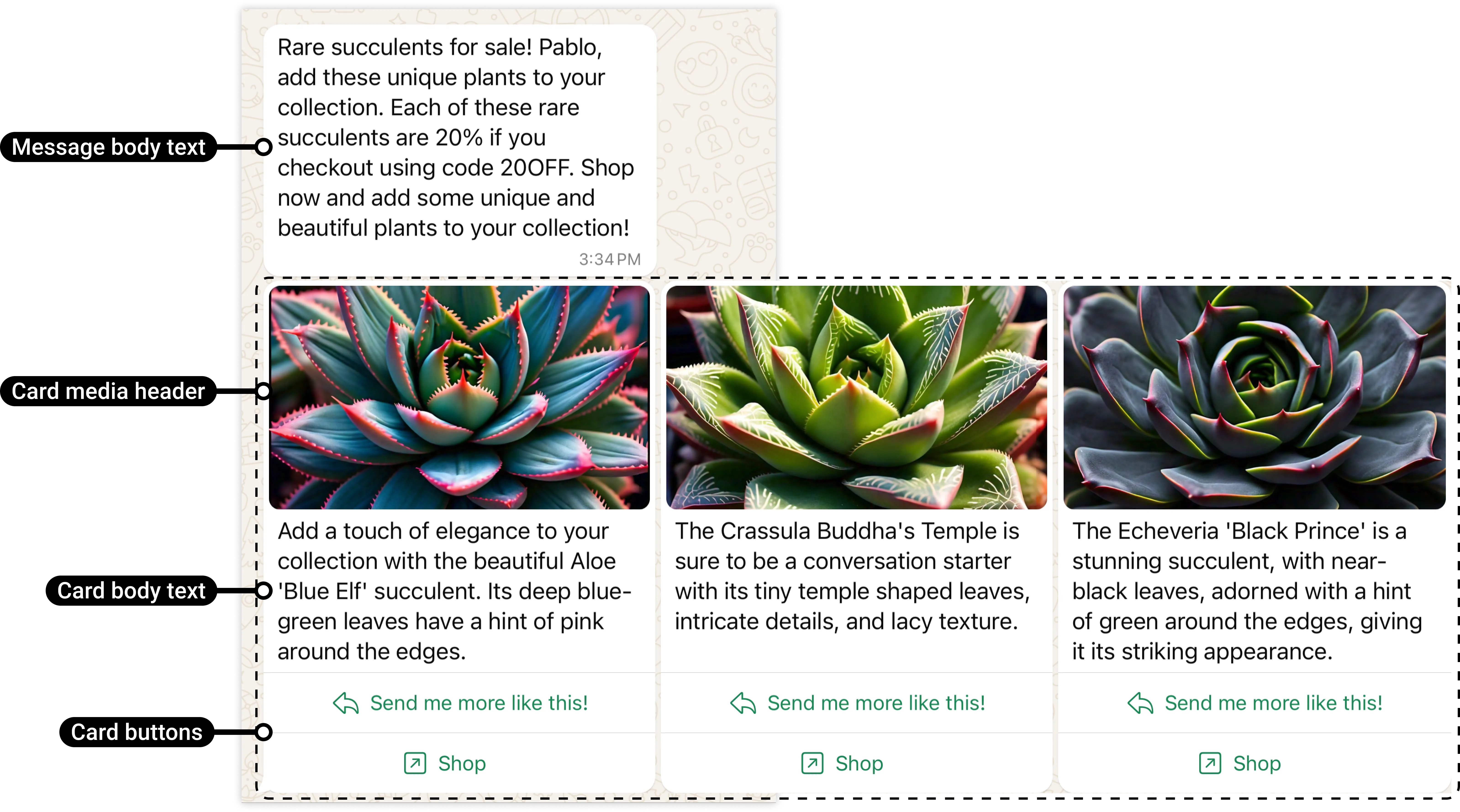 Media card carousel templates allow you to send a single marketing template message accompanied by a set of up to 10 product media cards in a horizontally scrollable view: