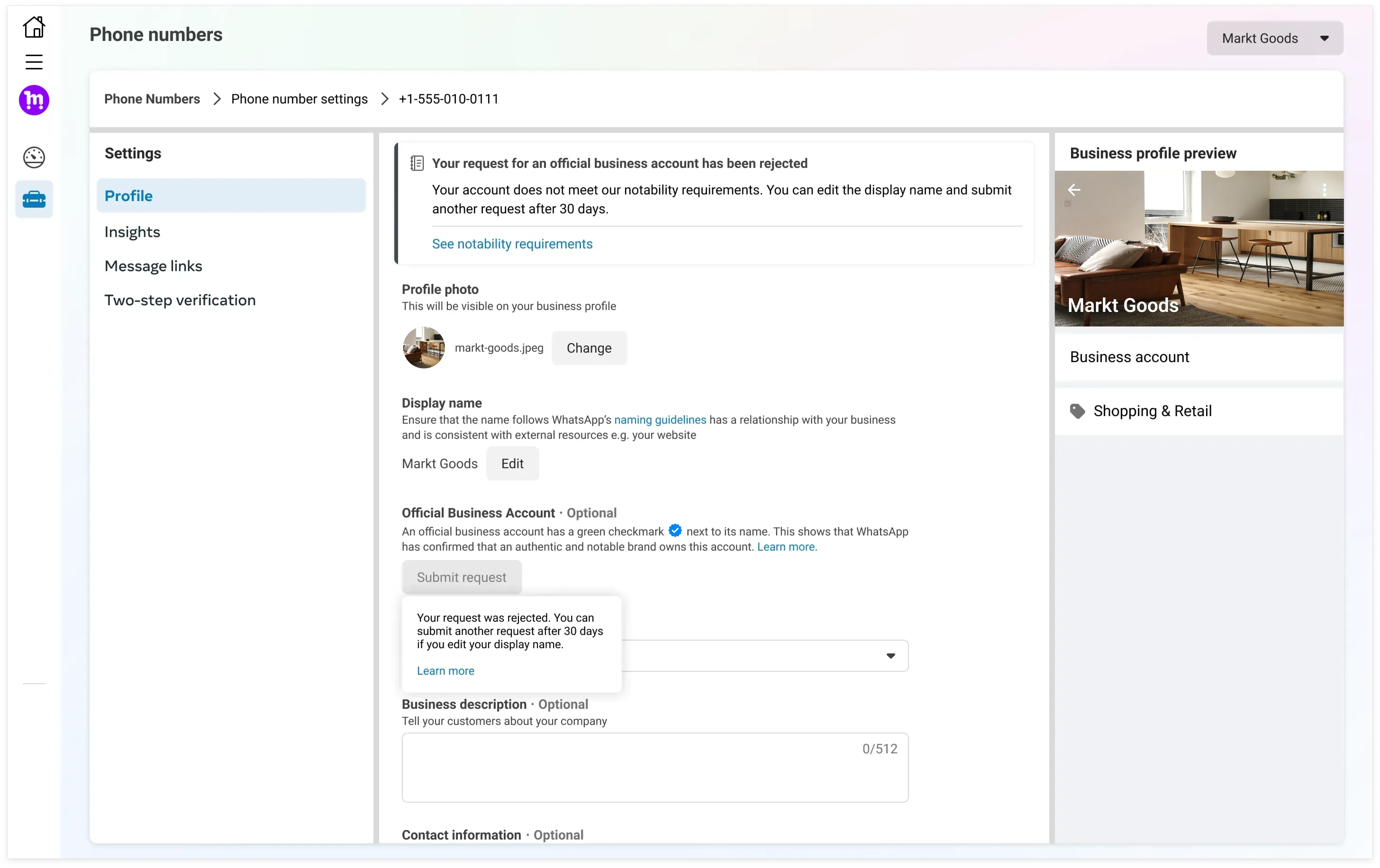 In the meantime, this decision does not limit your ability to share your business details. Each business phone number also has a business profile which includes the profile picture, email, website, and business description. These are fields that you can edit at any time.