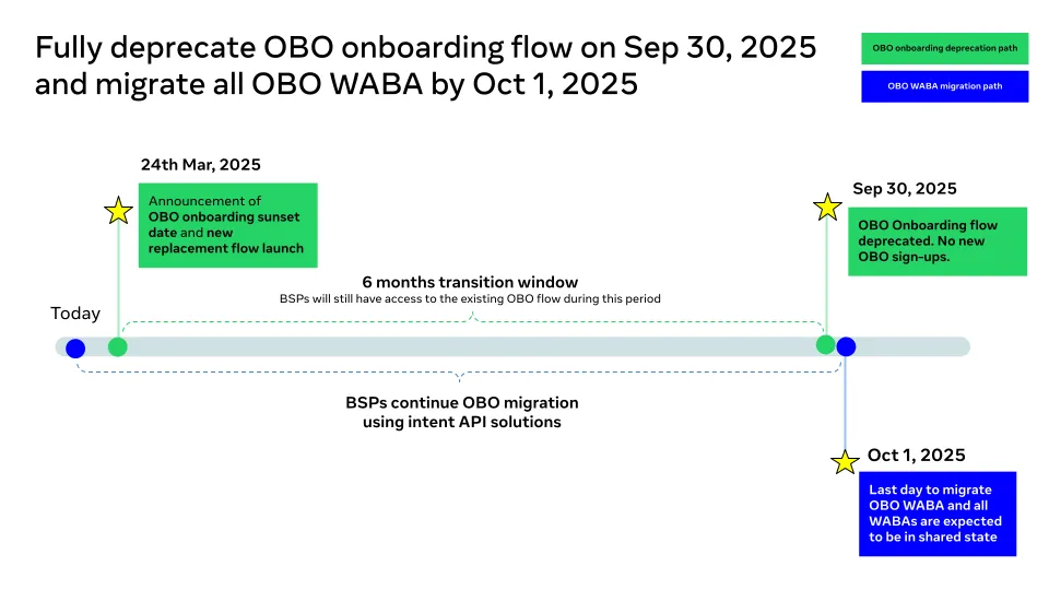 We have deprecated the On-Behalf-Of (“OBO”) account ownership model and replaced it with partner-initiated WABA creation. All existing WABAs created under the OBO model should have been transferred to business customers by October 1, 2025. Post 1st October 2025, all the eligible OBO accounts will be auto-migrated in batches through the end of 2025.