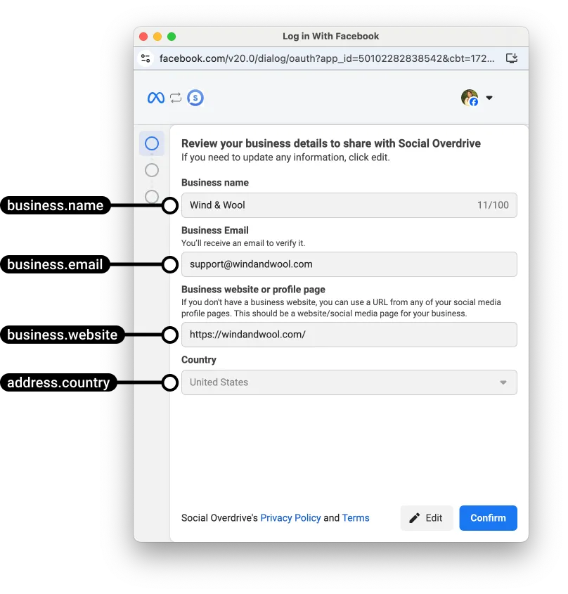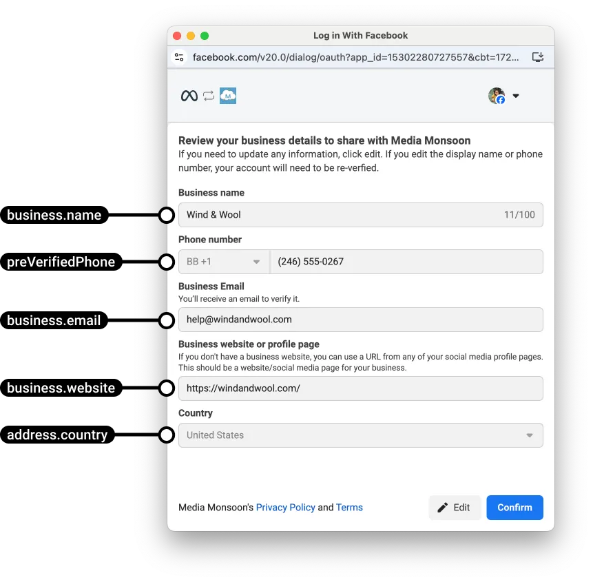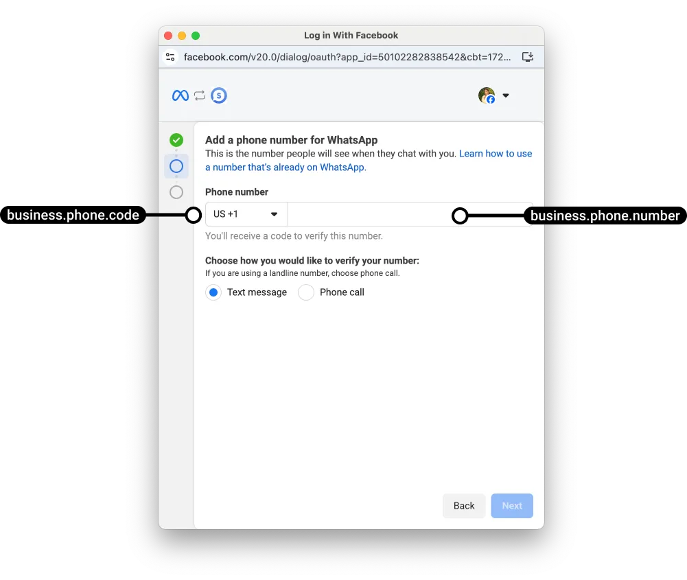 If you know details about your customer’s business, such as its name and address, you can inject this data into Embedded Signup. This can pre-fill screens or bypass them altogether, dramatically reducing the amount of input and interaction required by your customers.