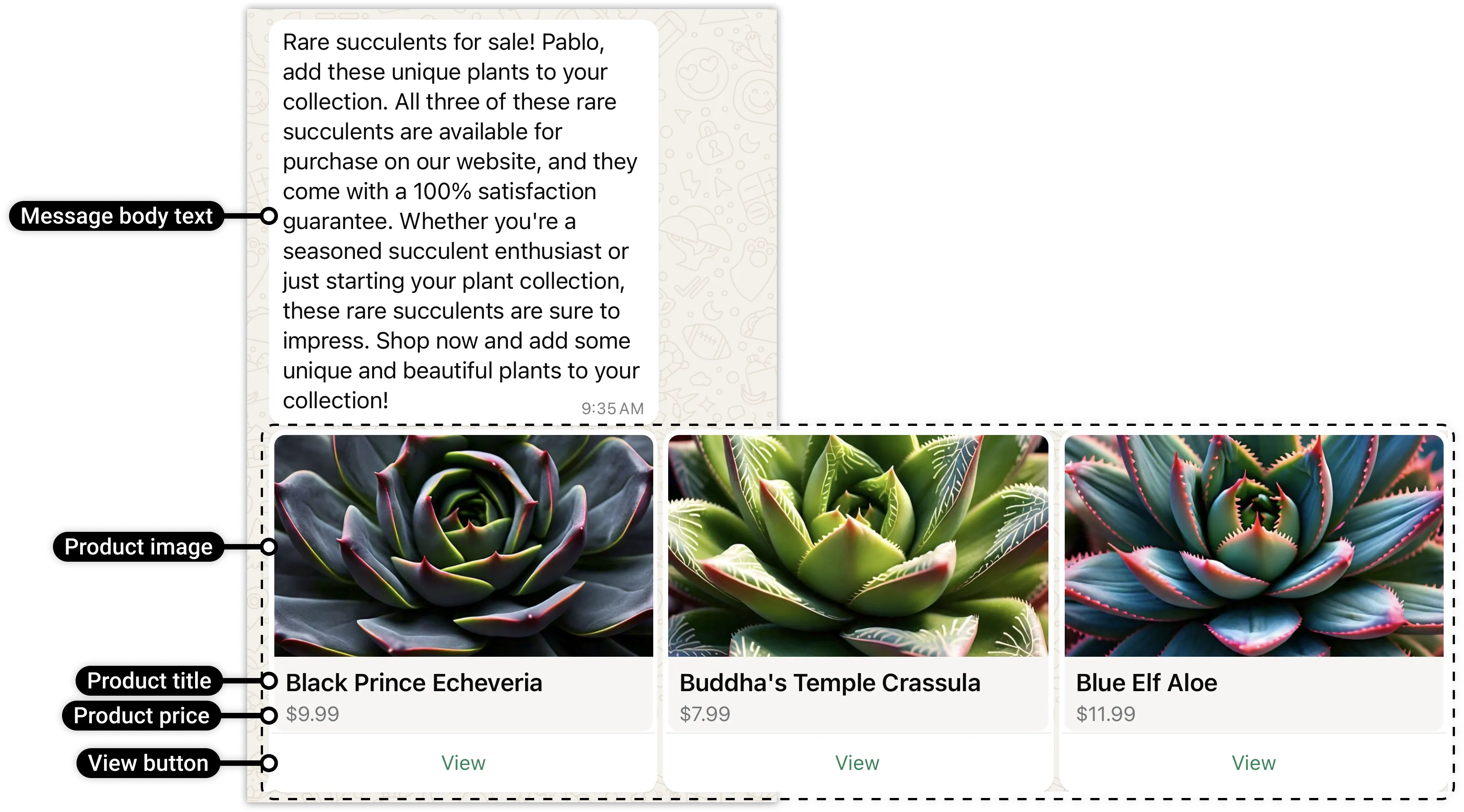 <MESSAGE_BODY_TEXT>String | Required. Message body text. Supports variables. Maximum 1024 characters. | Rare succulents for sale! {{1}}, add these unique plants to your collection. |