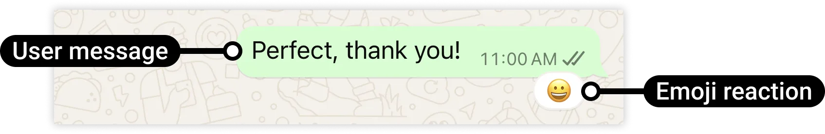 Reaction messages are emoji-reactions that you can apply to a previous WhatsApp user message that you have received.