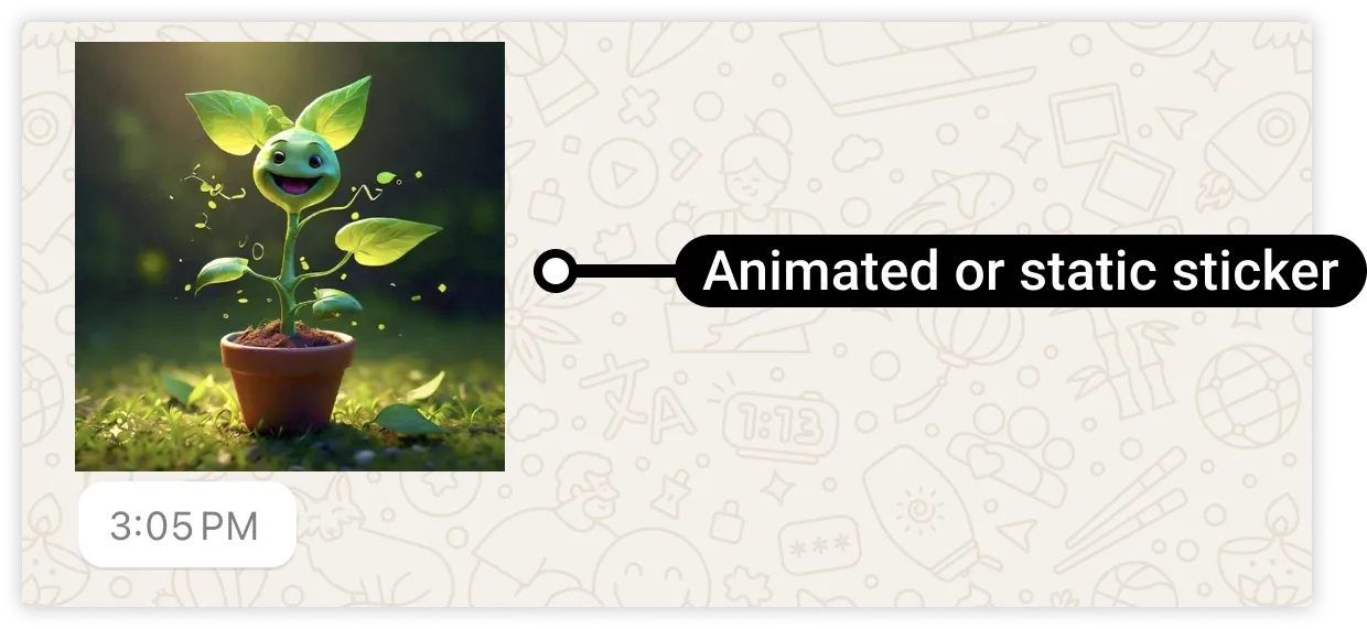 Sticker messages display animated or static sticker images in a WhatsApp message.