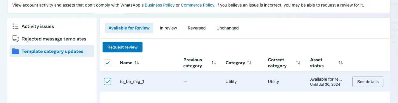 UTILITY as the template’s category and WhatsApp determined it should be MARKETING, the template is approved as MARKETING. In WhatsApp Manager, you will see the screen below. When using the API, the behavior will be as outlined above. You can request a review up to 60 days from the date the category was updated.