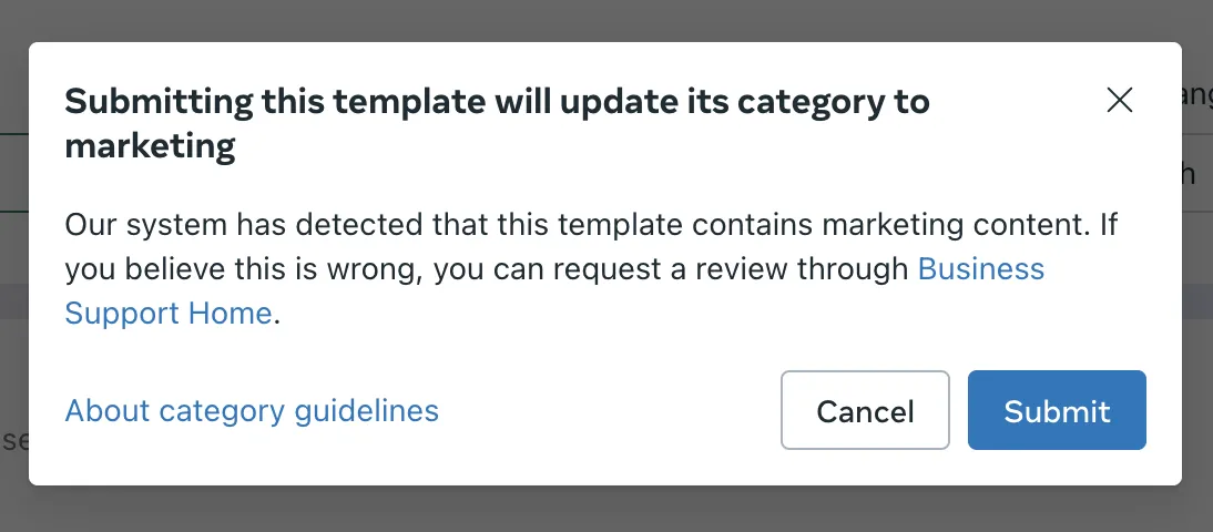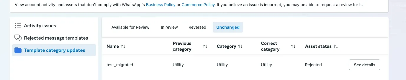 If the template category change is not approved: The template can be viewed in Business Support under the Template category updates > Unchanged tab. The template’s category will change to the correct category during an automatic category update.