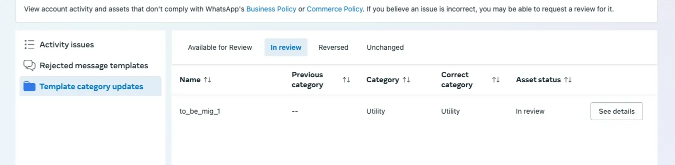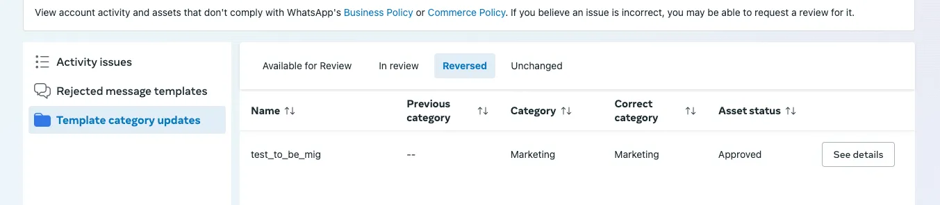 If the template category change is approved: the template can be viewed in Business Support under the Template category updates > Reversed tab. If the template category was already changed during automatic category update, it will be reverted to its previous category.