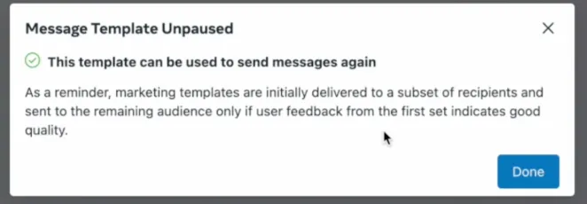 A template will unpause on its own after satisfying the pause duration outlined above. Once unpaused, the template’s status will be set to Active and you may begin sending it to customers again. If you didn’t halt any automated messaging campaigns that relied on a paused template, they should start working again. However, we recommend that you halt any campaigns that rely on a template that has been paused until it is unpaused, because our APIs will reject your requests anyway.