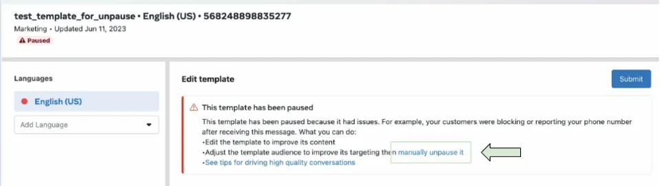 /{whats_app_message_template_id}/unpauseWhatsApp Manager by clicking the manually unpause it link highlighted in the screenshots below.Note that templates paused during Template Pacing must be manually unpaused (API or WhatsApp Manager) before they can be used again.