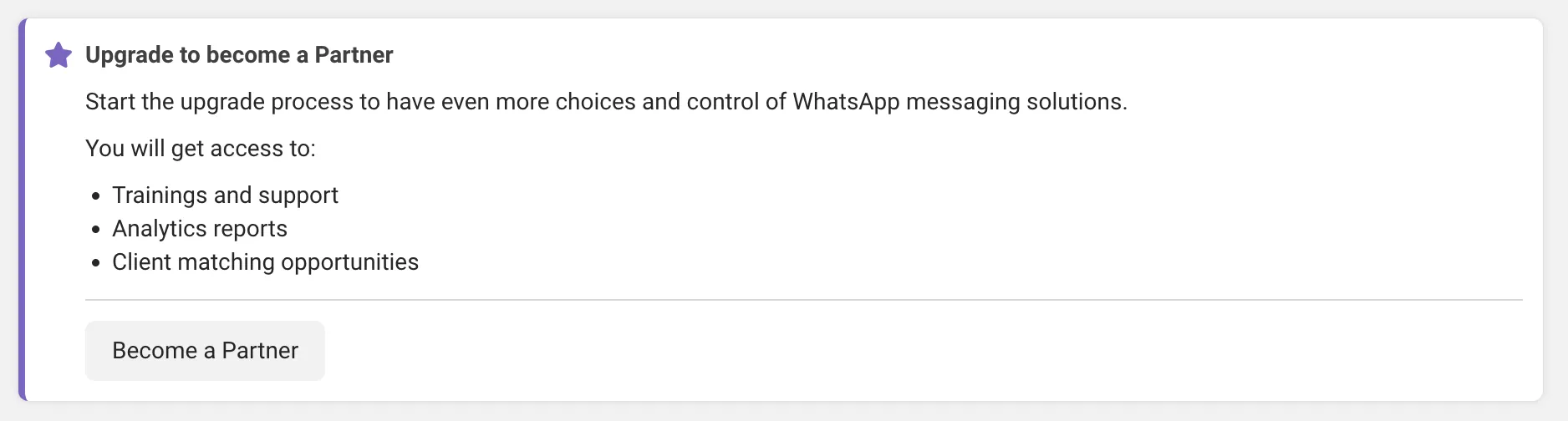 Becoming a Tech Partner allows you to have even more choices and control of WhatsApp messaging solutions. It also grants access to benefits such as: