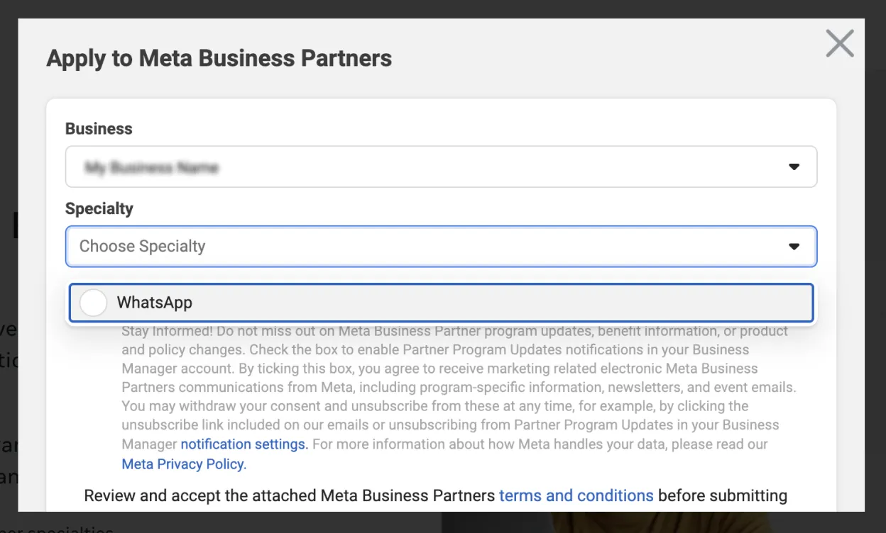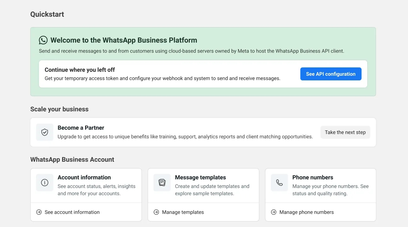 In the App Dashboard, navigate to WhatsApp > Quickstart, and in the Become a Partner section, click the Take the next step button.