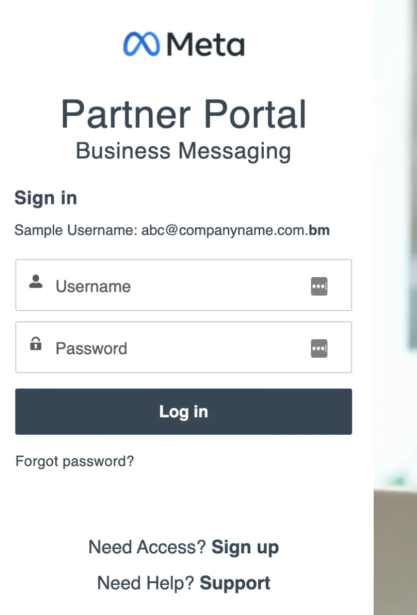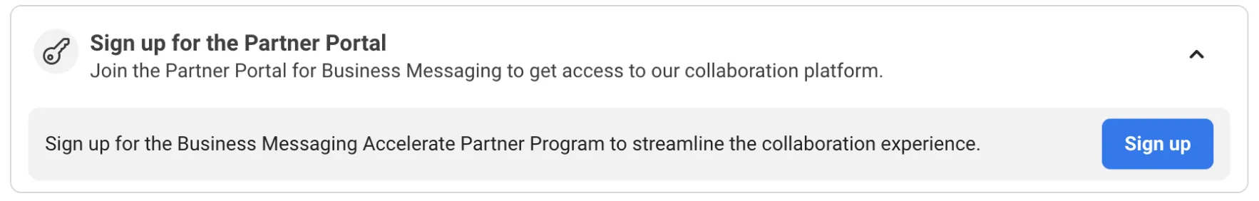 Navigate back to the Onboarding page in Meta for Developers and scroll down to the Sign up for the Partner Portal step. Click Sign up and on the Partner Portal login screen select the link to Sign up. Add your name and business ID and accept the agreement to create the account.