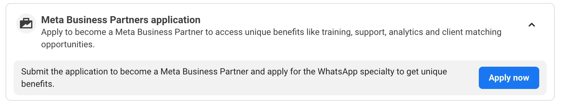 Return to the Onboarding page inside of Meta for Developers and navigate to the Meta Business Partners application step, then click the Apply now button to submit an application to become a Meta Business Partner and apply for the WhatsApp Specialty.