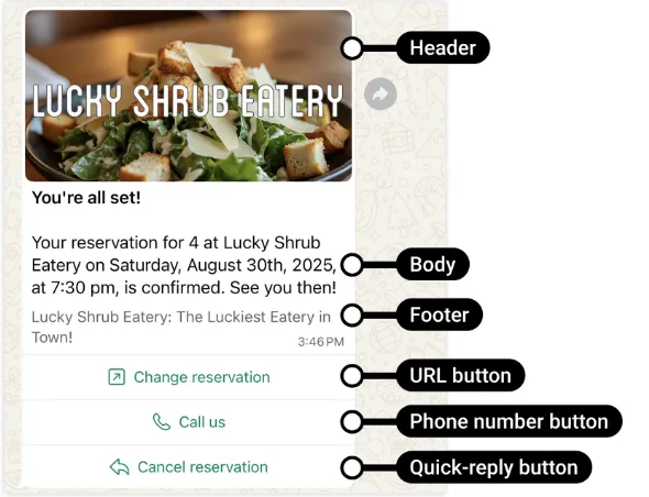 "text": "*You're all set!*\n\nYour reservation for {{number_of_guests}} at Lucky Shrub Eatery on {{day}}, {{date}}, at {{time}}, is confirmed. See you then!",
