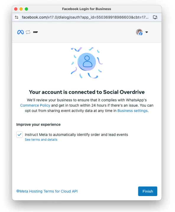 When the customer clicks Finish, a message event will be triggered, containing the customer’s WABA ID and business phone number ID, which you must then use to onboard the customer to the platform.