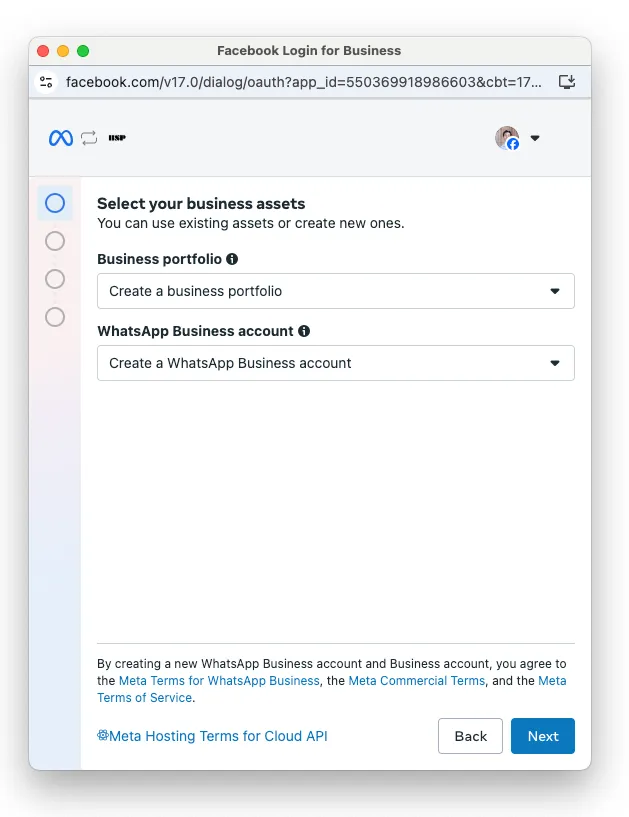 This screen gives customers the option to select existing business assets such as a Meta business portfolio and WhatsApp Business Account.