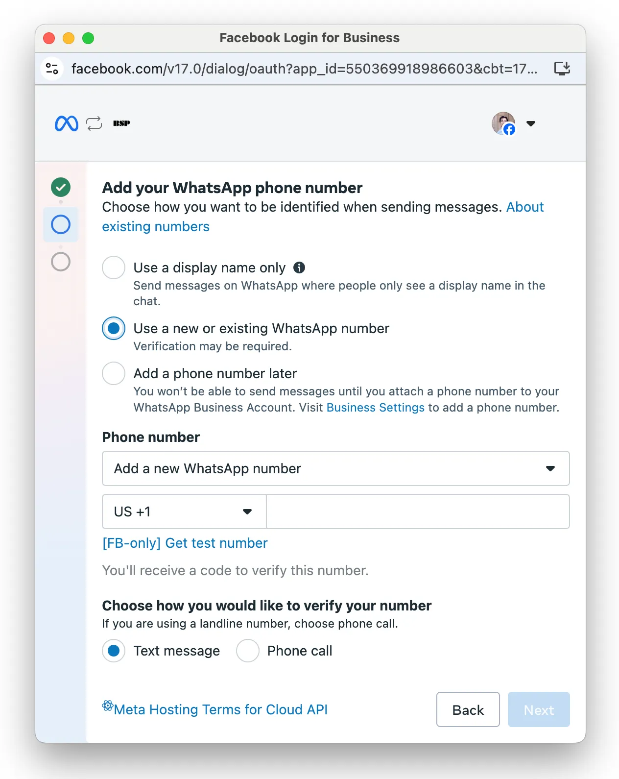 This screen allows the business customer to enter a new business phone number to associate with their WhatsApp Business Account.