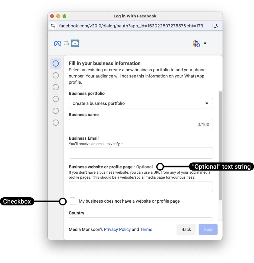 By default, the website field is required in the business portfolio screen. If you have been approved for Partner-led Business Verification however, the website field will become optional and will be accompanied by a My business does not have a website or profile page checkbox: