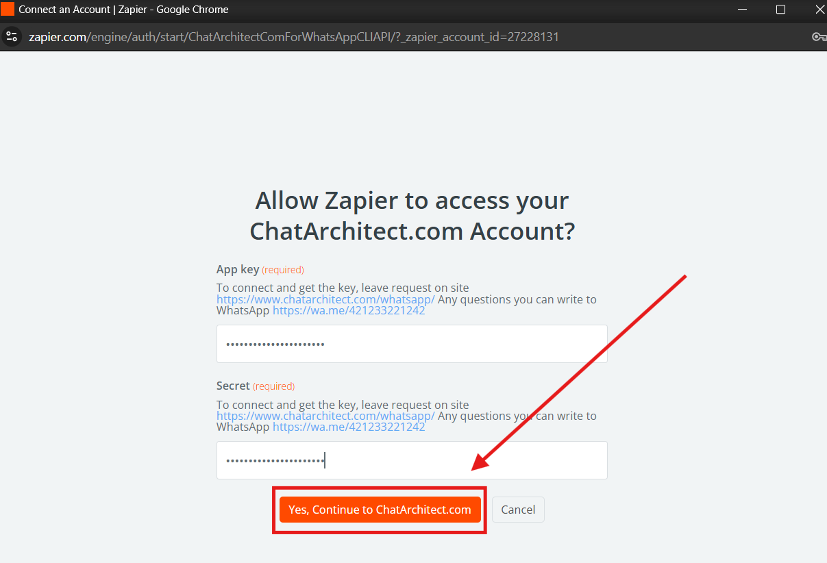 3. Fill in your APP ID and APP SECRET and press "Yes, continue to ChatArchitect.com"