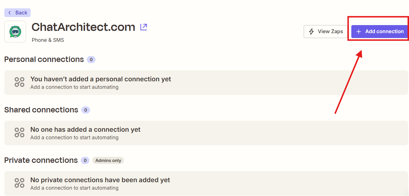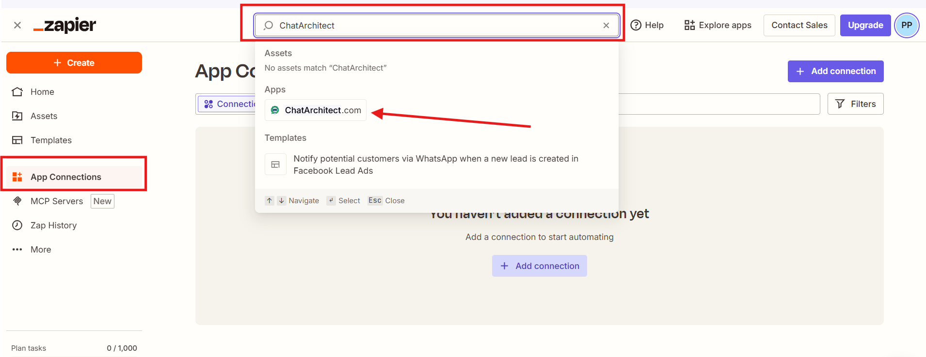 1. Go to the "App Connections" -> in the search field write "ChatArchitect" and choose our app.