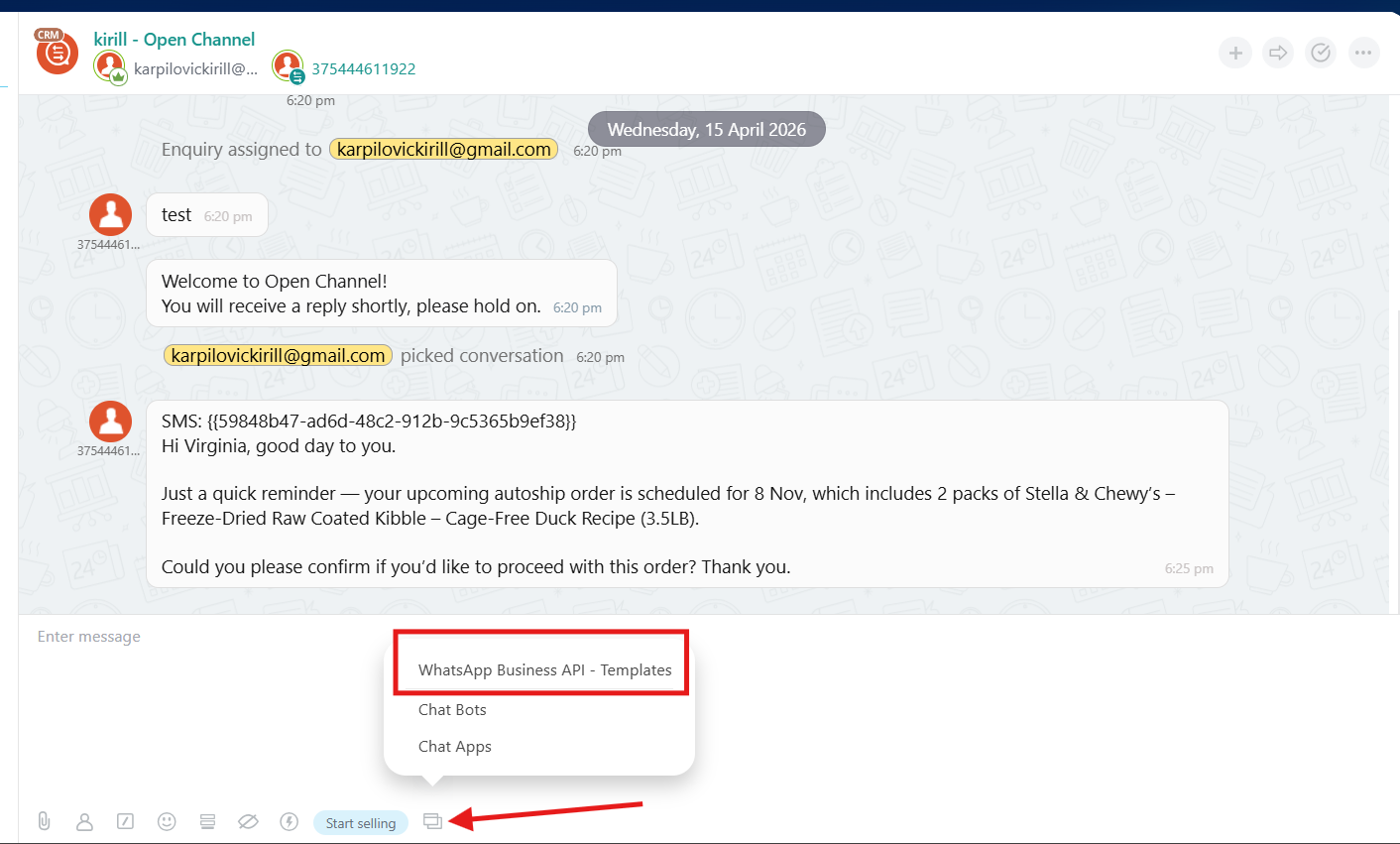 3. You will be redirected to Open Lines. In the chat window, at the bottom, there will be a button (indicated by an arrow in the screenshot). Click on it and select "WhatsApp Business API templates."