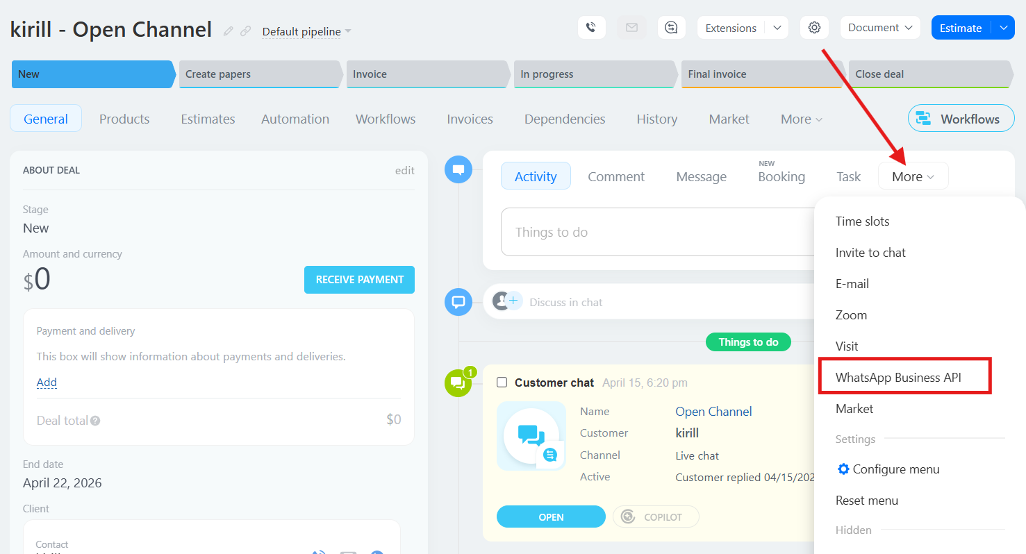 2. Press "More" and choose our entity "WhatsApp Business API"